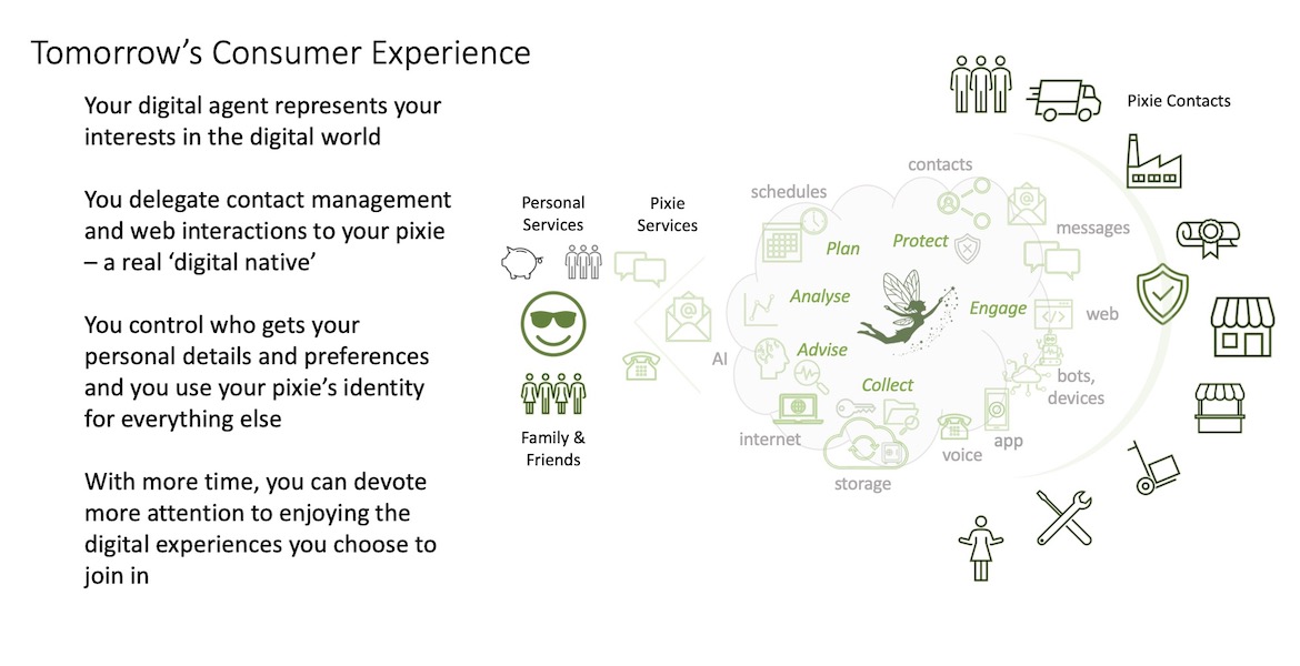 A pixie can be your personal contact centre, research assistant, personal shopper, events manager, record keeper, reminder...Allowing you to consume more digital services, more securely, with less time and attention - to help you live your best digital life.